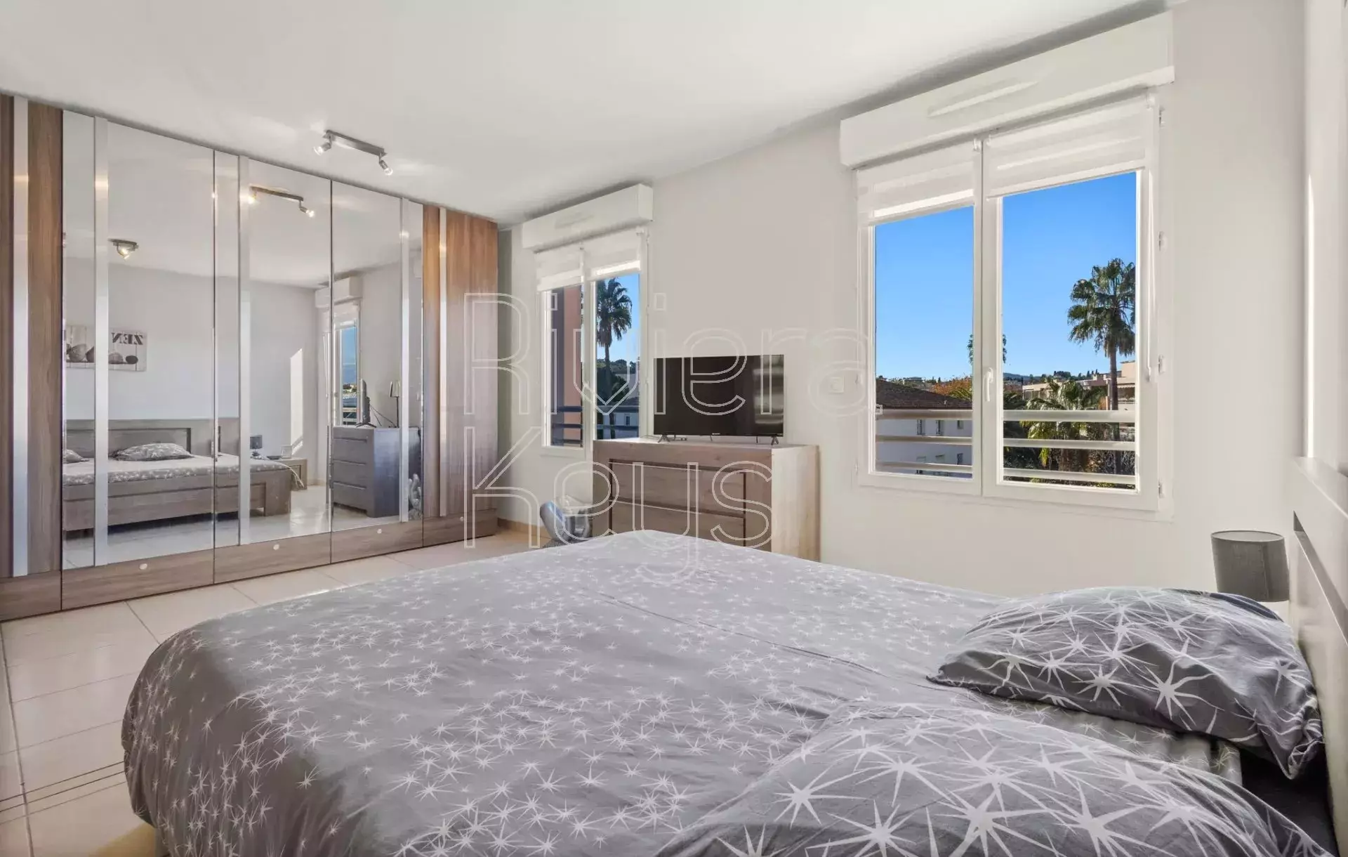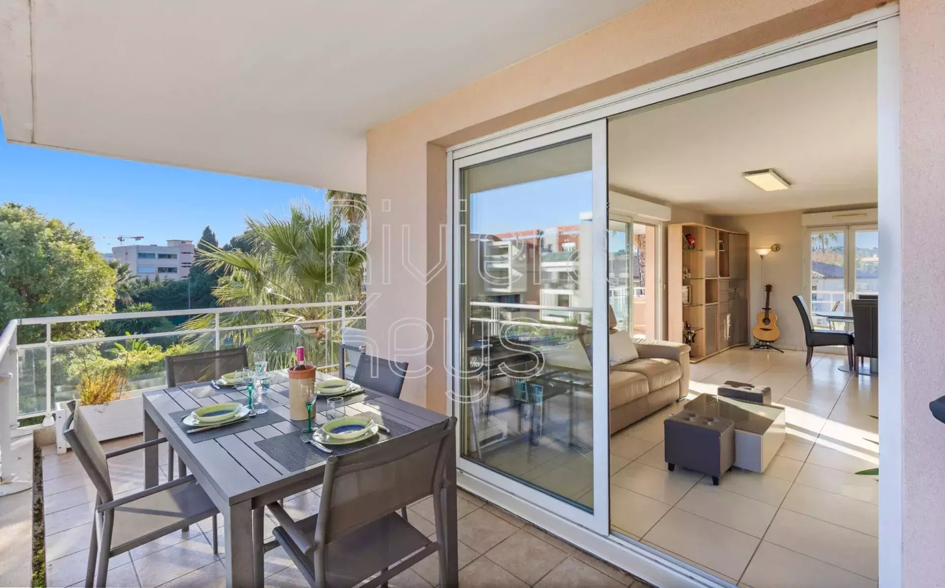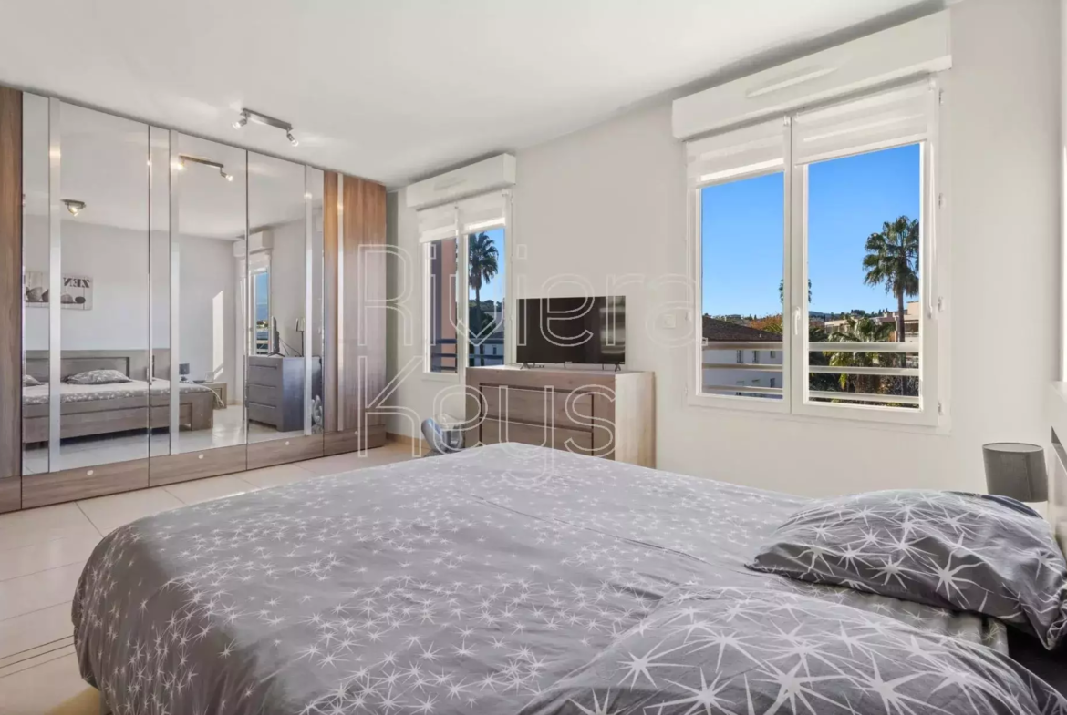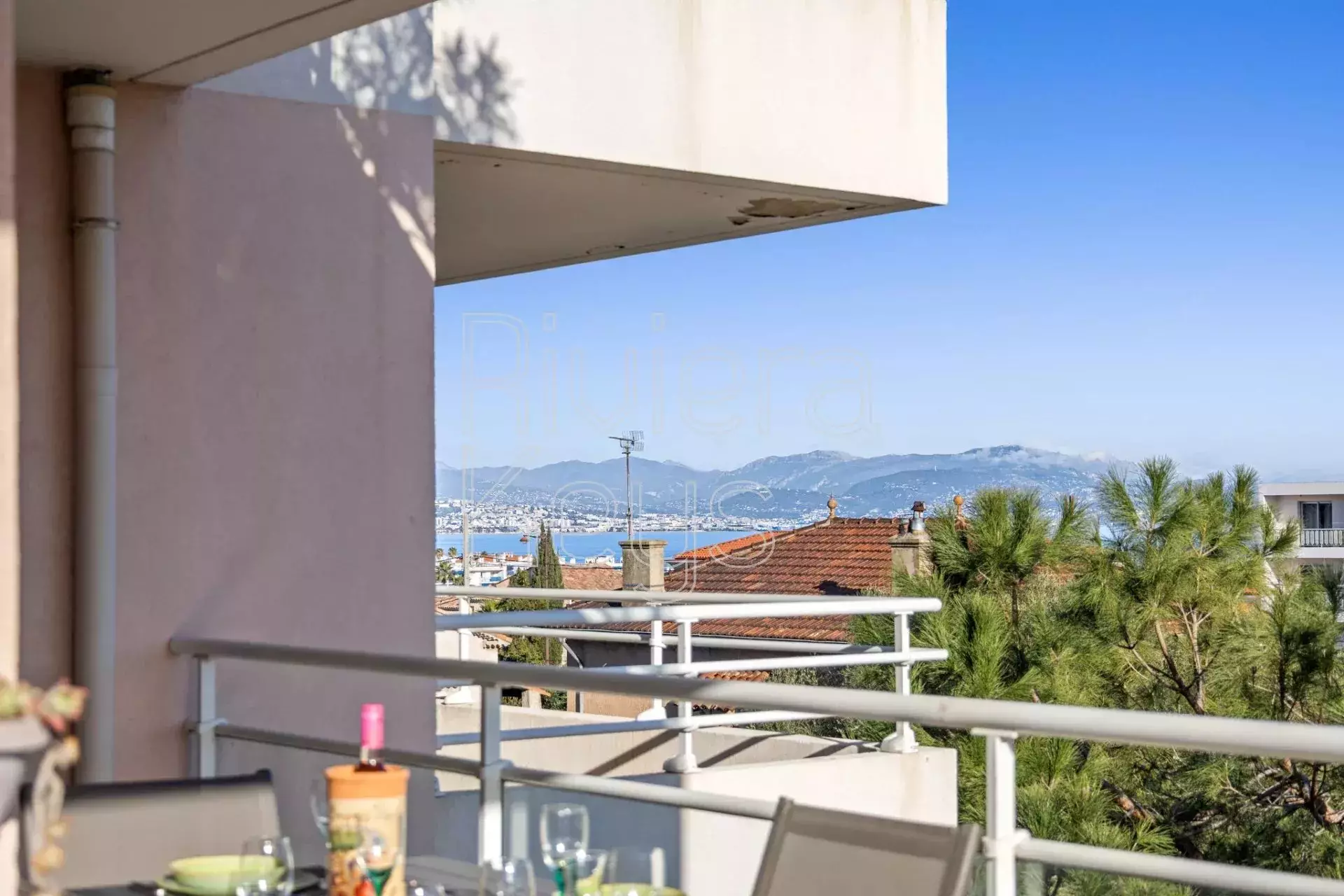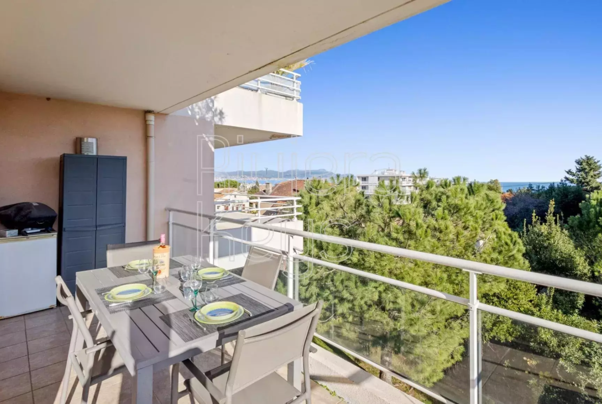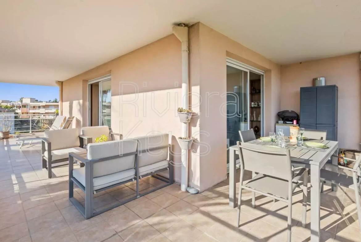 Antibesin rauhallisella esikaupunkialueella sijaitseva, korkean kerroksen läpitalon asunto, jolla on aurinkoinen kulmaterassi.