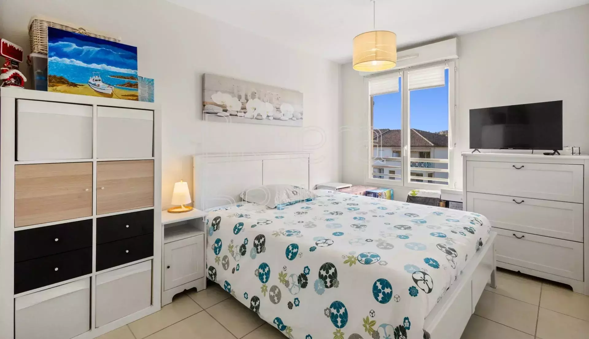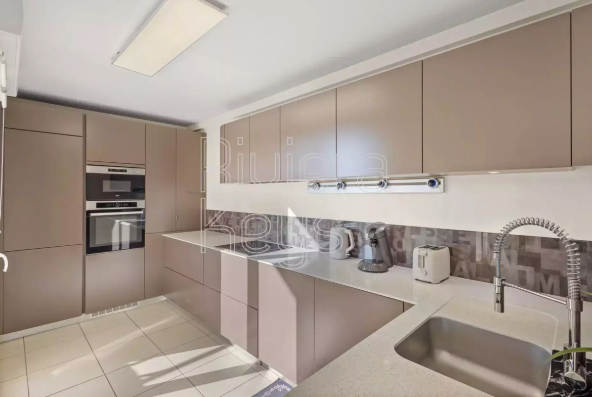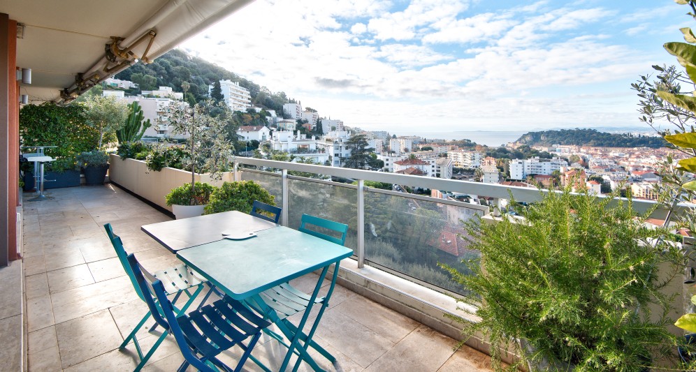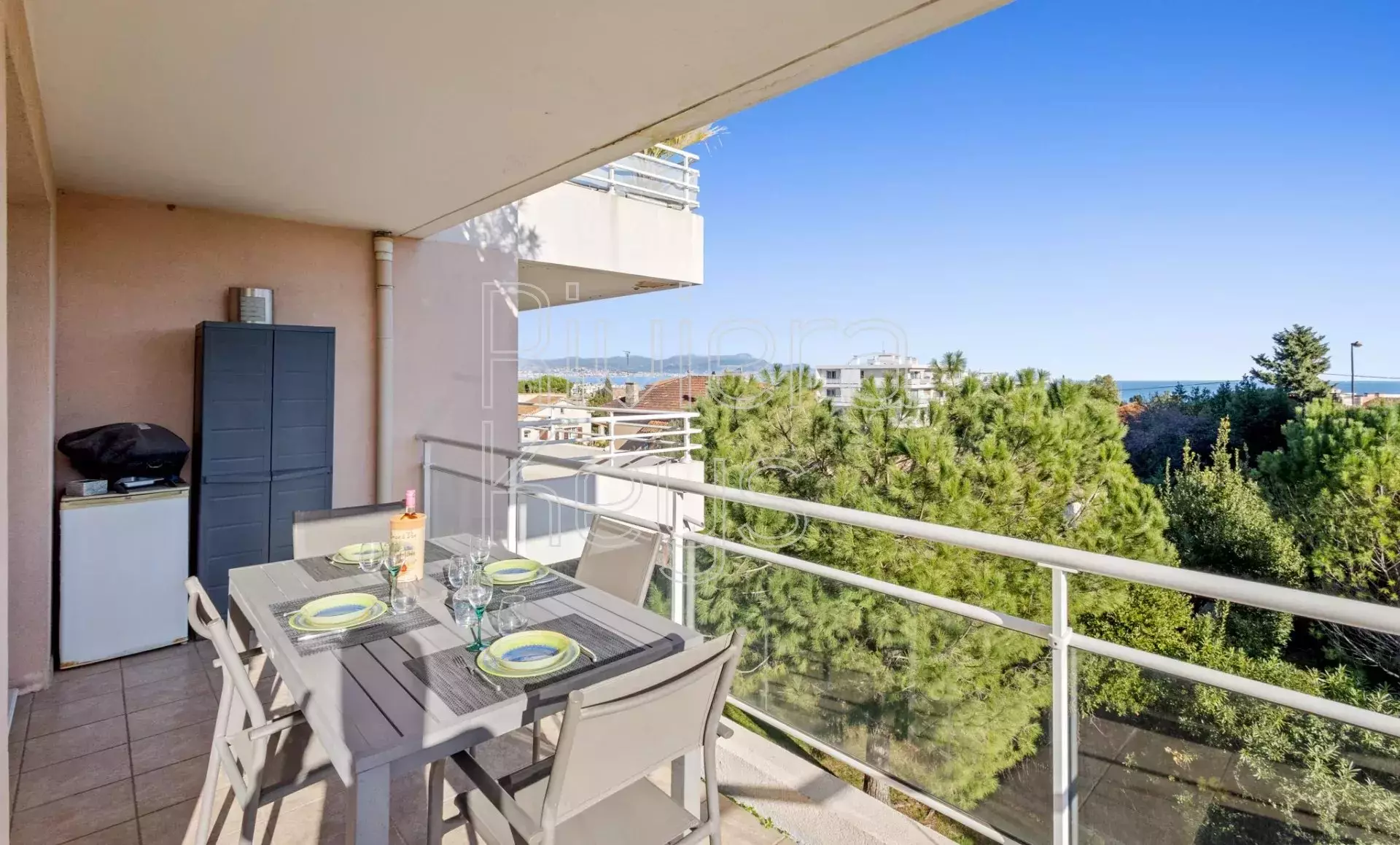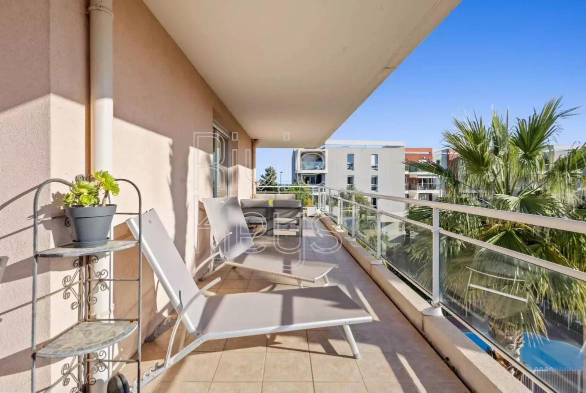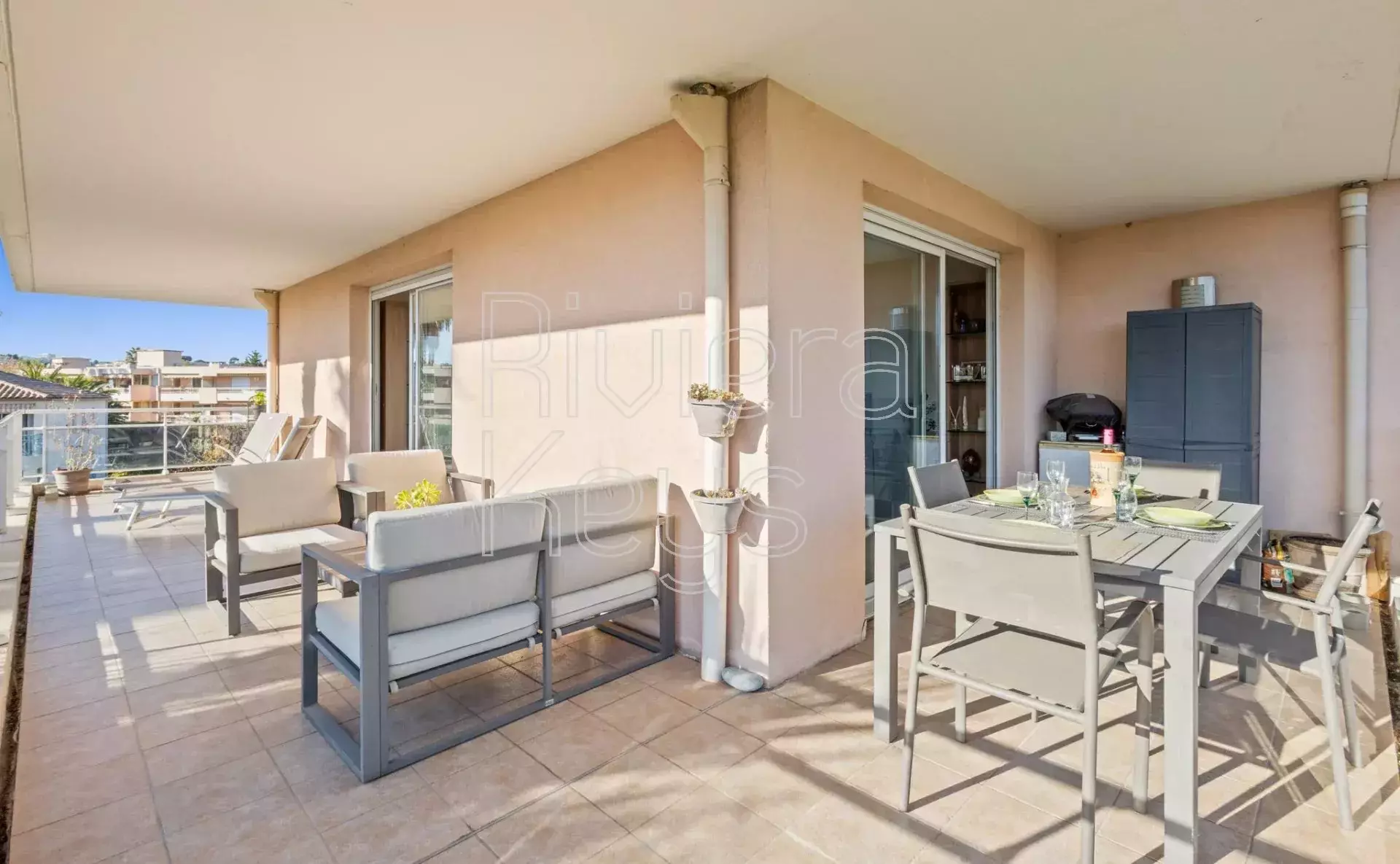 Antibesin rauhallisella esikaupunkialueella sijaitseva, korkean kerroksen läpitalon asunto, jolla on aurinkoinen kulmaterassi.