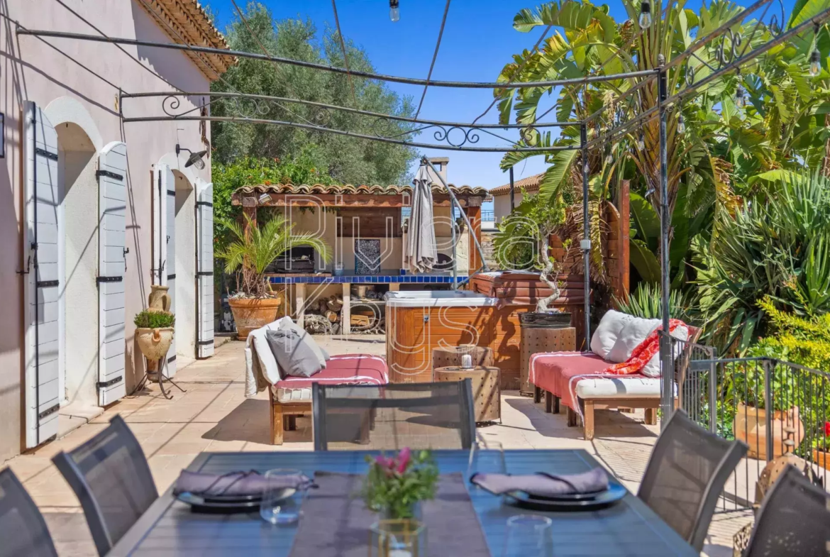 Etelään suuntautuvalla tontilla on useita terasseja, uima-allas, jacuzzi, kesäkeittiö ja tilaa usealle autolle. Ihanteellinen sijainti rauhallisella alueella lyhyen matkan päässä kaikista palveluista ja rannasta.