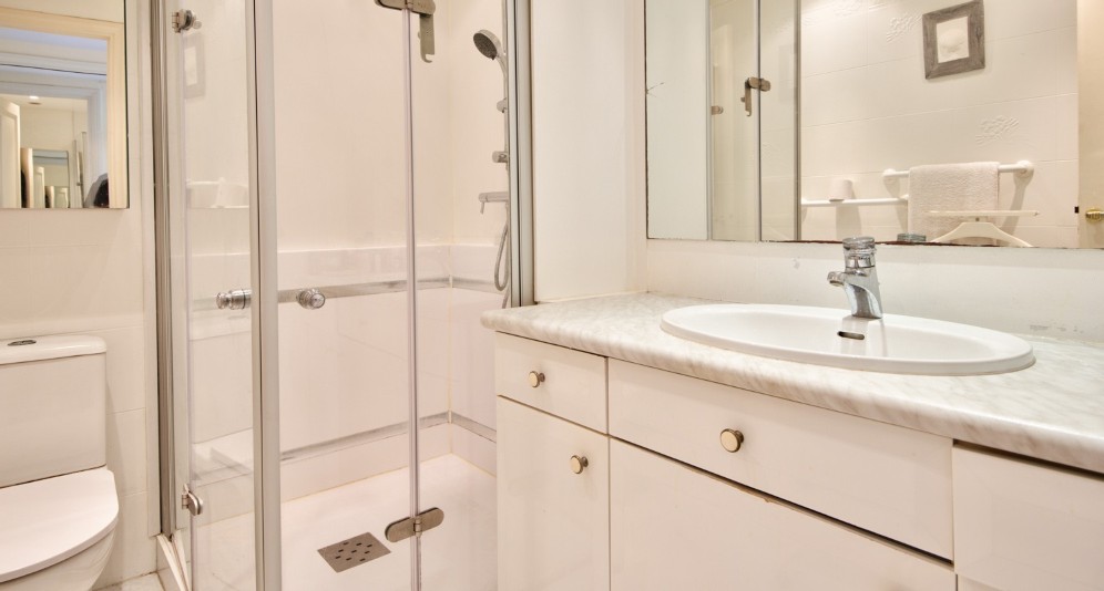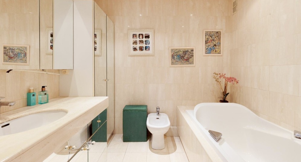 Asunnossa on valoisa olohuone, erillinen keittiö, kaksi makuuhuonetta, kaksi kylpyhuonetta ja kaksi erillistä wc:tä. Olohuoneesta ja toisesta makuuhuoneesta on käynti 20 m2:n terassille etelään, jolta aukeaa merinäkymät. Asuntoon kuuluu parkkipaikka hallista.