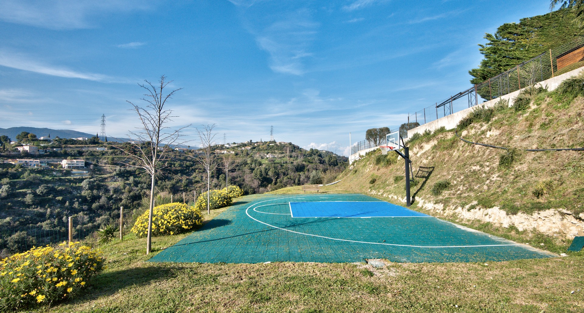 Lounaaseen suuntautuvalla, suurella tontilla on useita terasseja, kaunis puutarha, 15 m pitkä uima-allas, koripallokenttä, autotalli, autokatos ja parkkitilaa usealle autolle. Ei häiritsevää näköyhteyttä muista asunnoista.