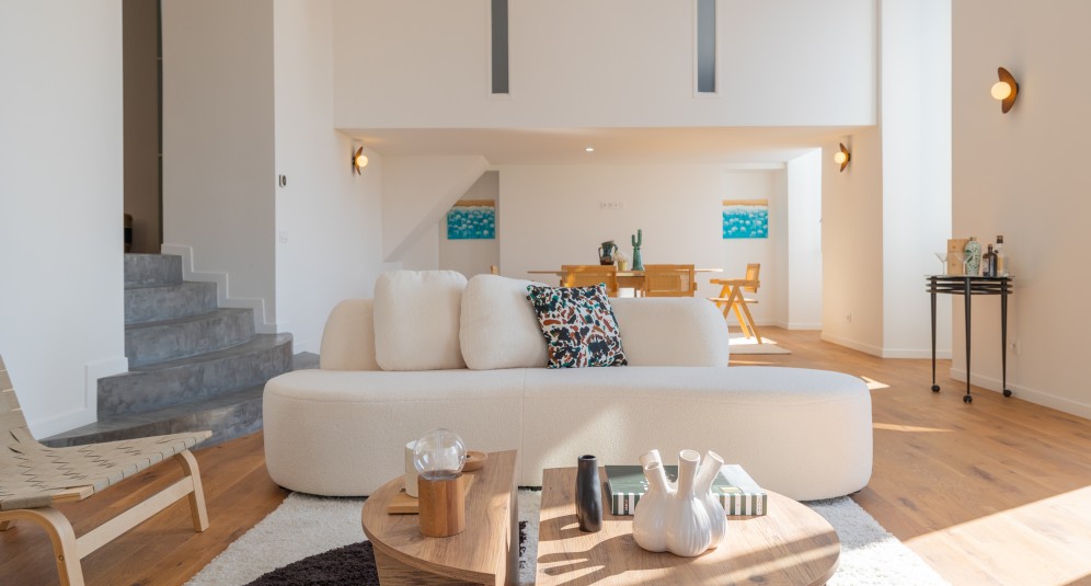Asunnossa on eteinen, suuri olohuone, avokeittiö, kolme makuuhuonetta omilla vaatehuoneillaan, kaksi kylpyhuonetta ja kaksi erillistä wc:tä. Korkeakattoisesta olohuoneesta on käynti 26 m2:n aurinkoiselle terassille. Asunto sijaitsee 1. kerroksessa, suomalaisittain 2. kerros eikä talossa ole hissiä.