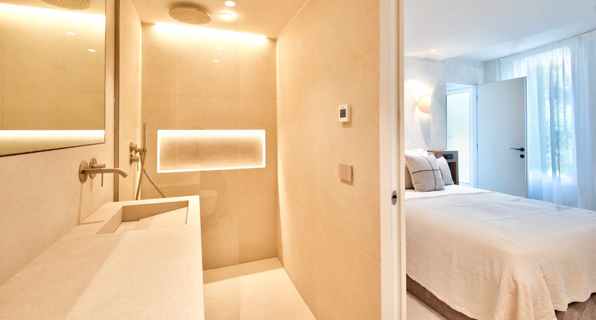 Alakerrassa on kaksi makuuhuonetta omilla kylpyhuoneillaan.