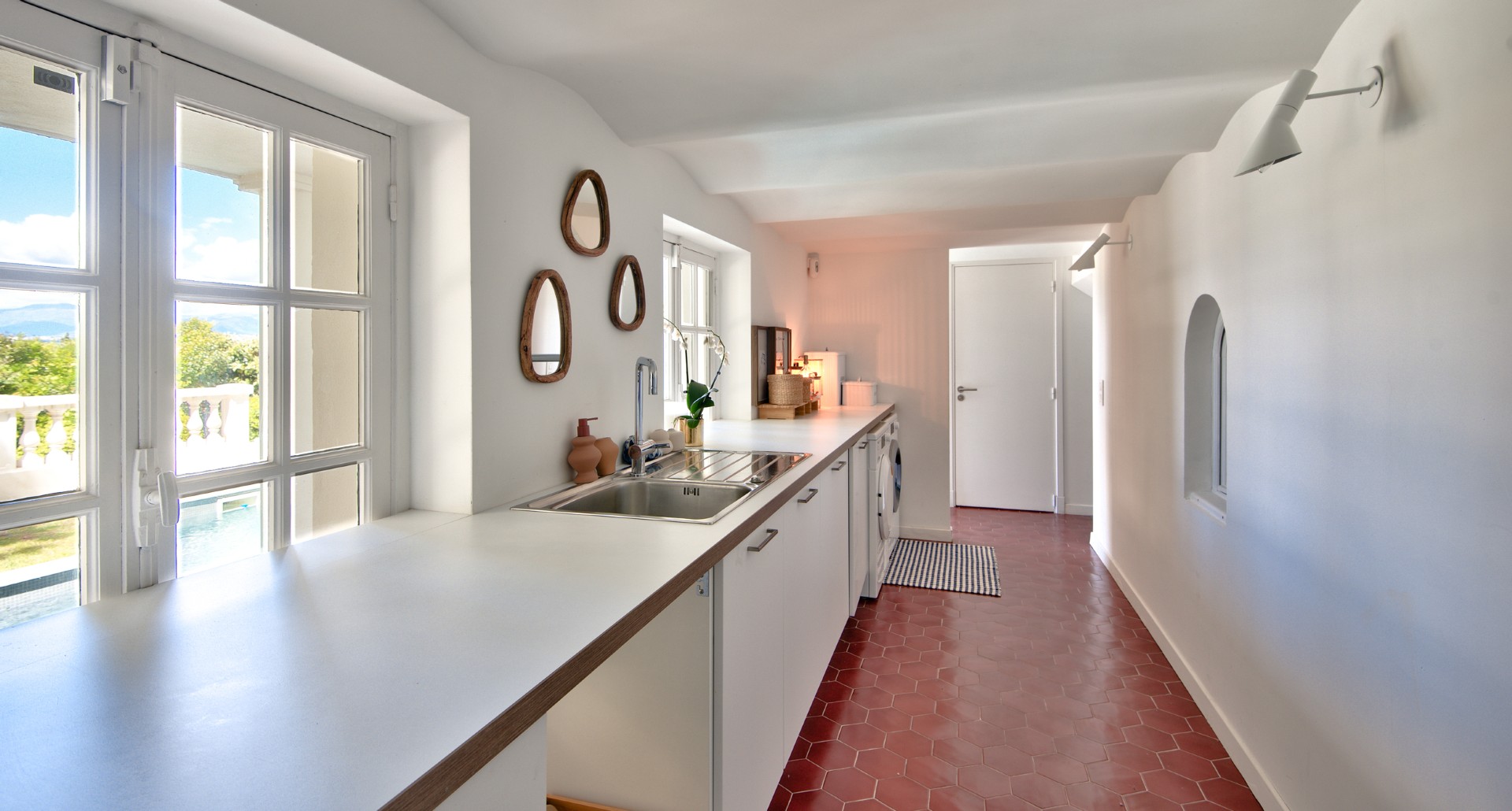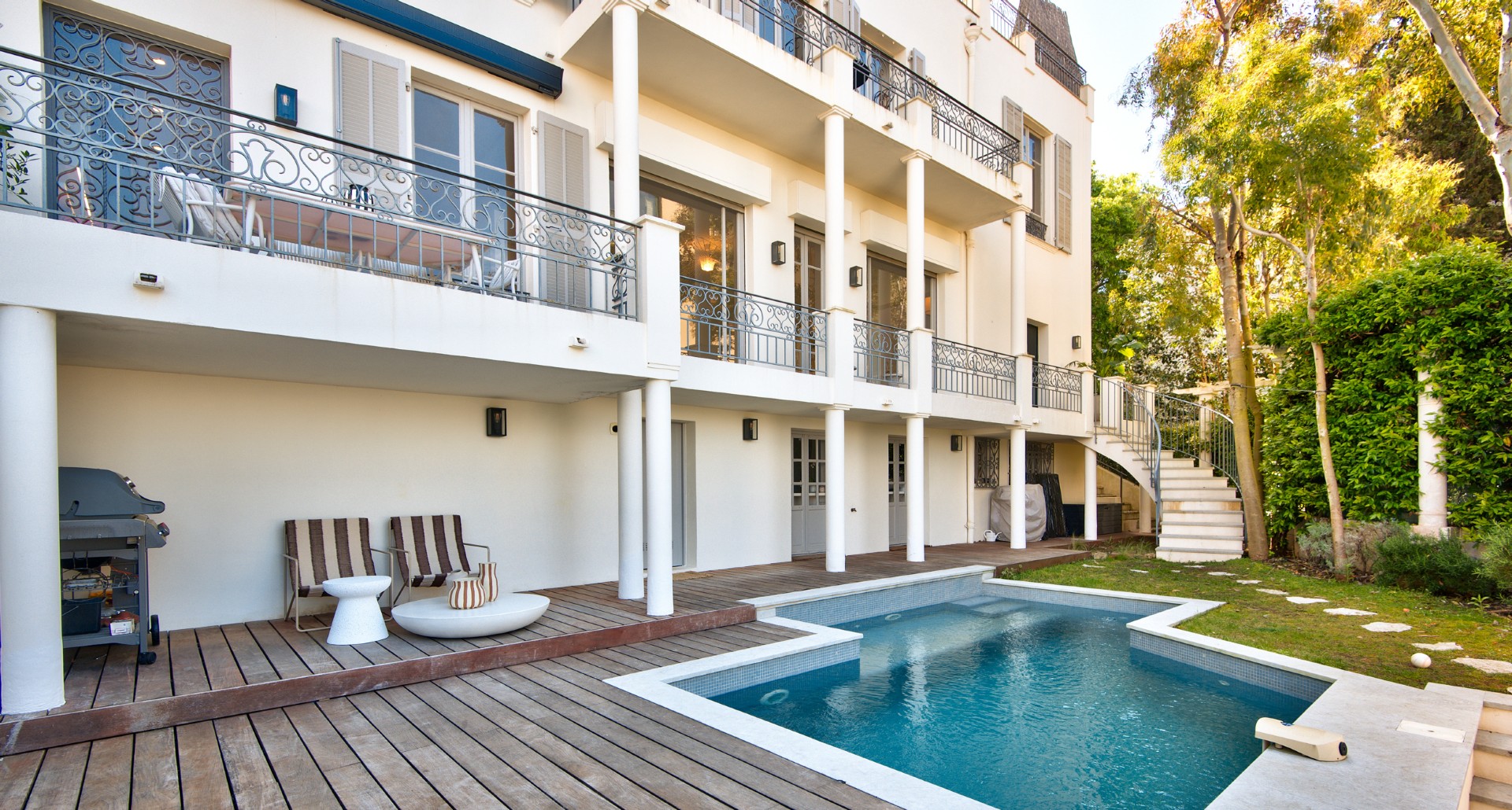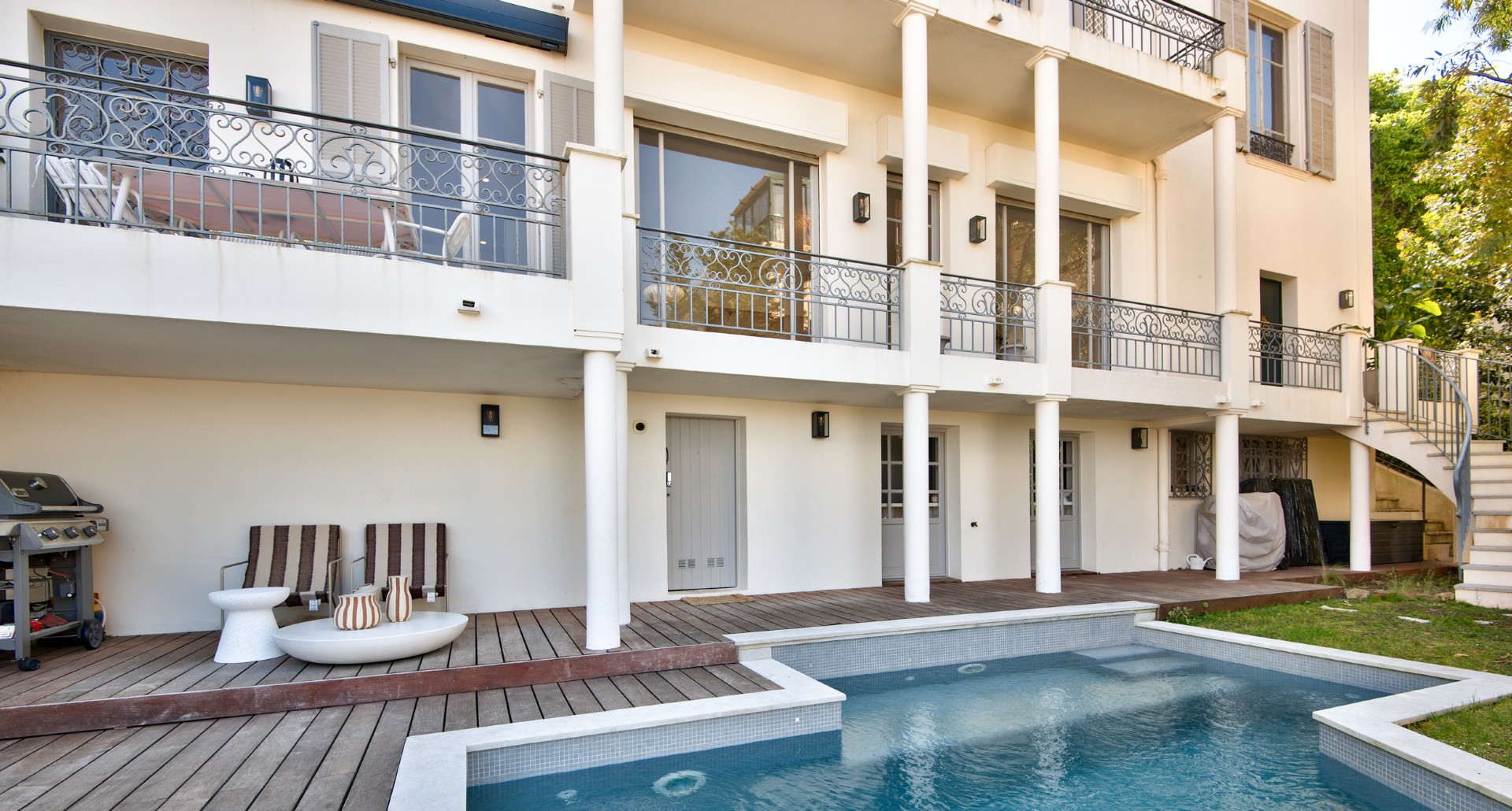 Pihan tasolla on viides makuuhuone omalla kylpyhuoneellaan, kodinhoitohuone, uima-allas, pool-house sekä varastotilaa.