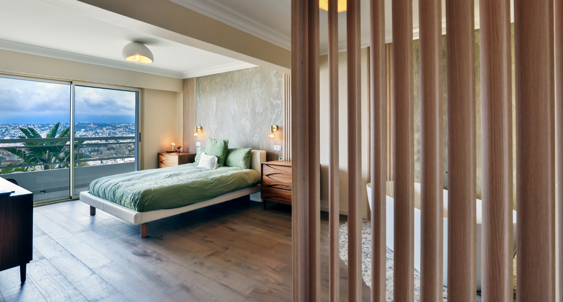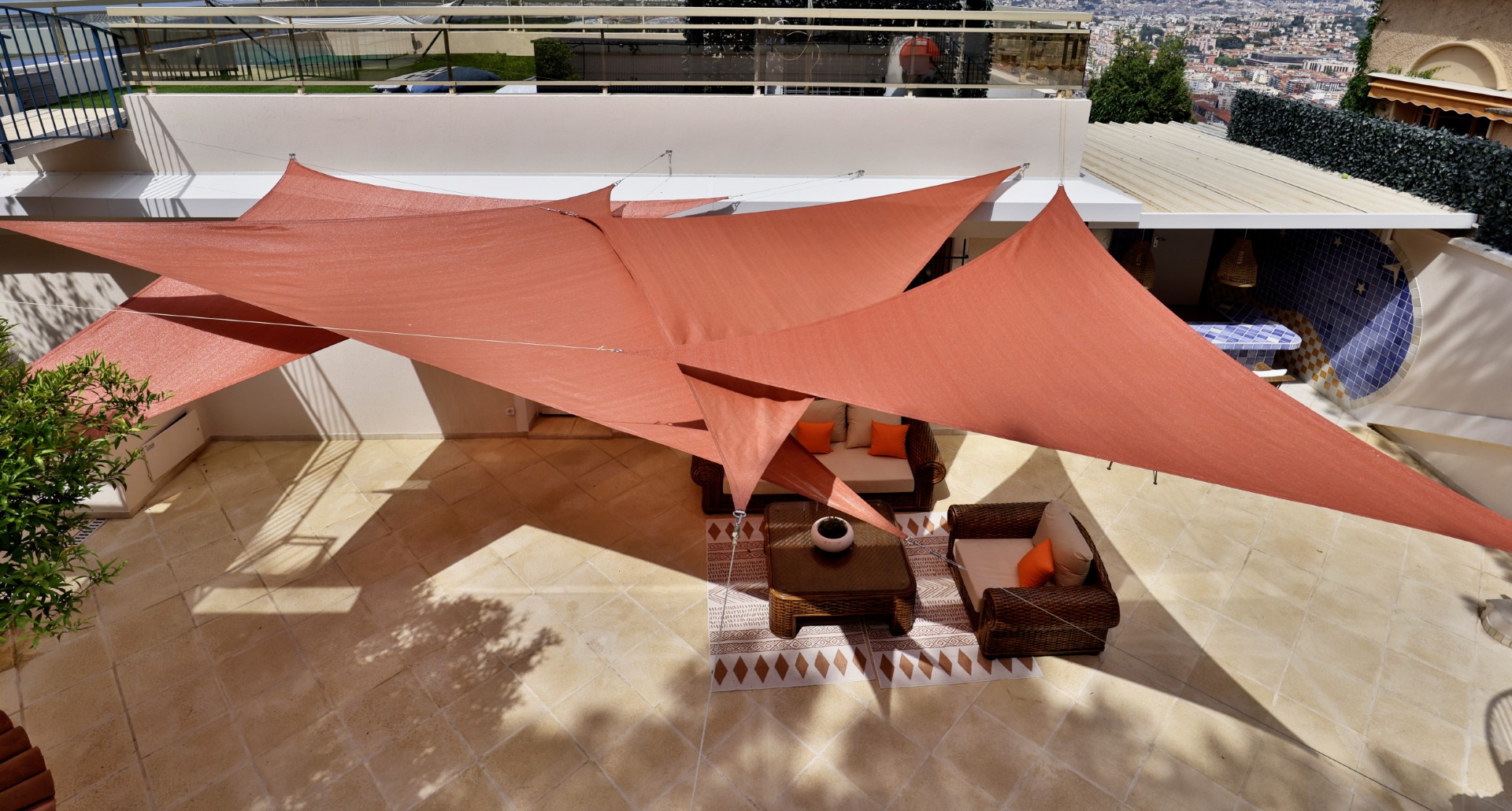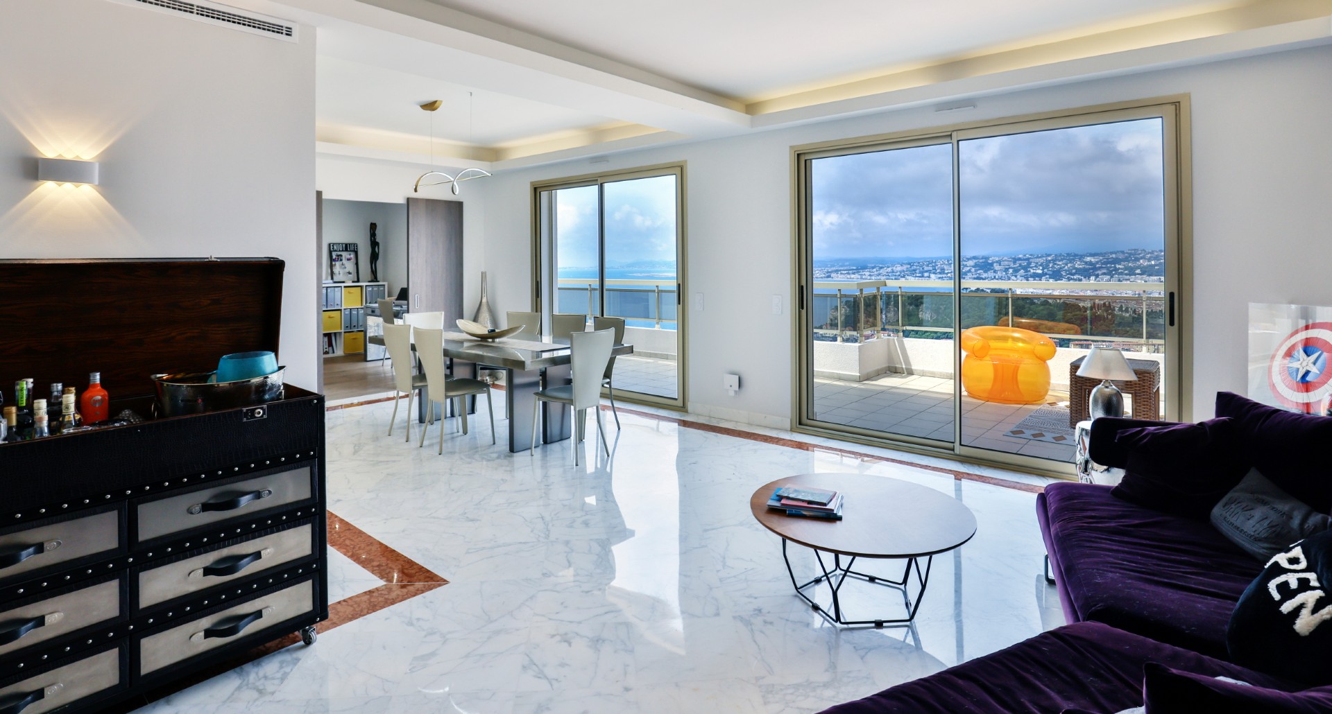 Monesta huoneesta aukeaa huikeat panoraamanäkymät merelle ja Nizzan kaupungin ylle. Talolta on suora käynti Mont-Boronin metsäiseen puistoon ja lyhyt ajomatka sataman ja keskustan kaikkien palveluiden pariin.