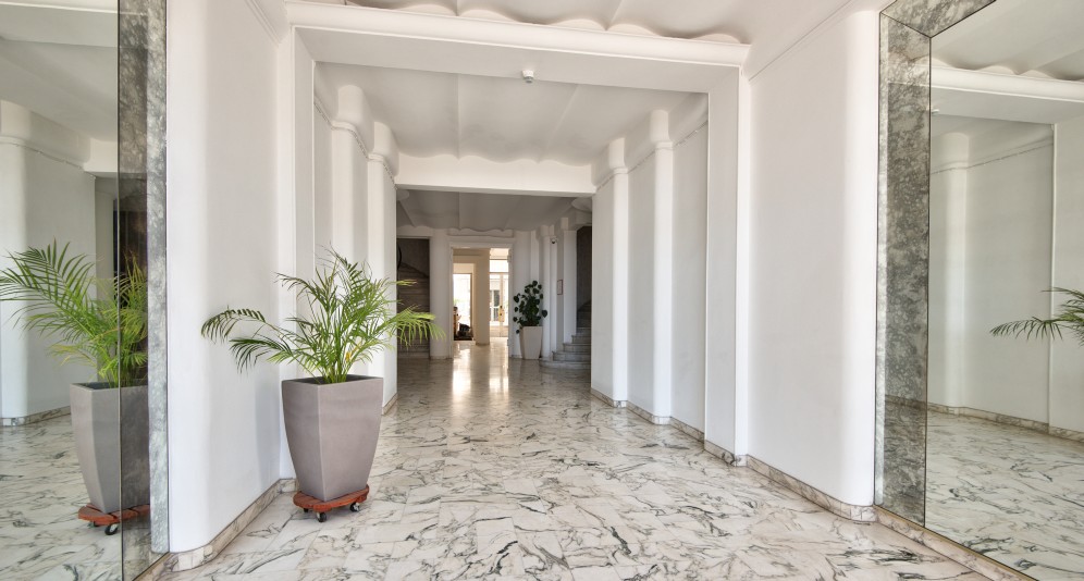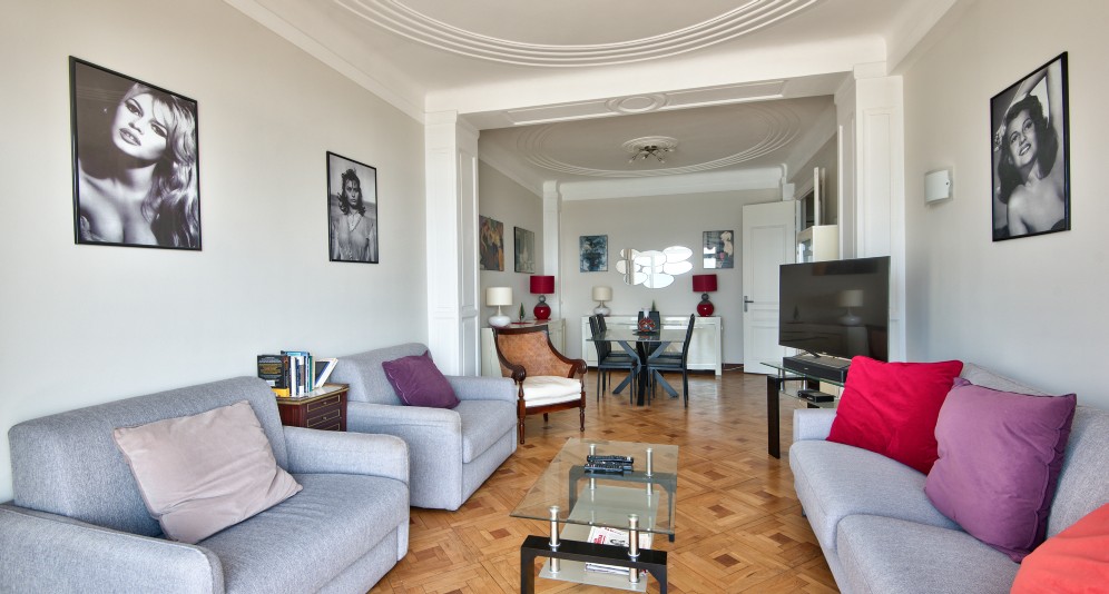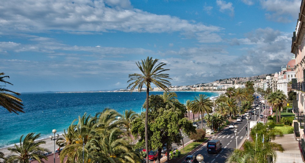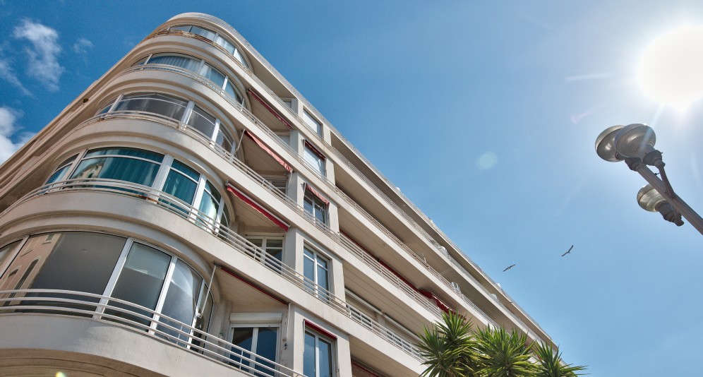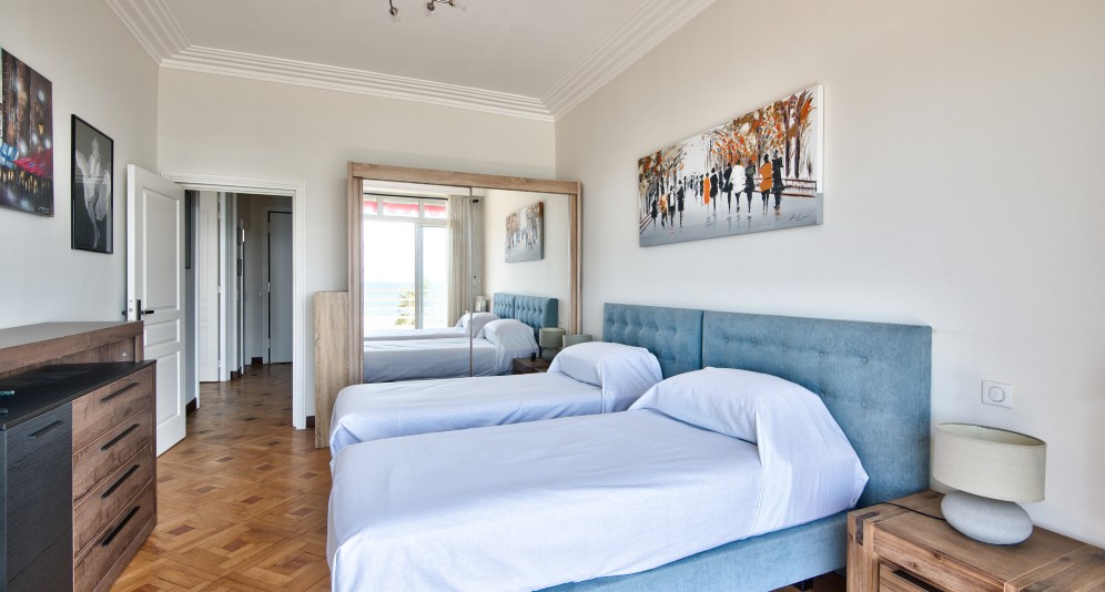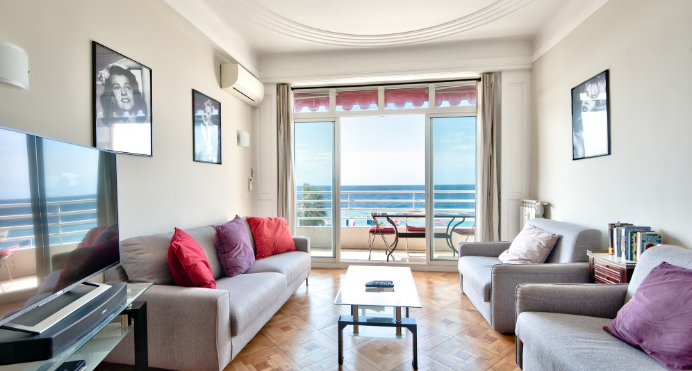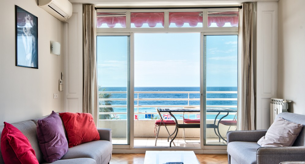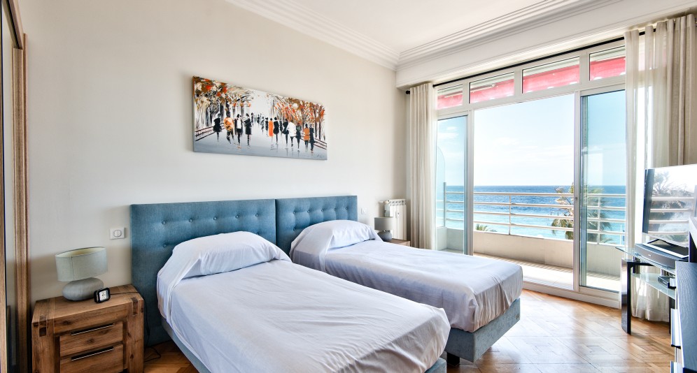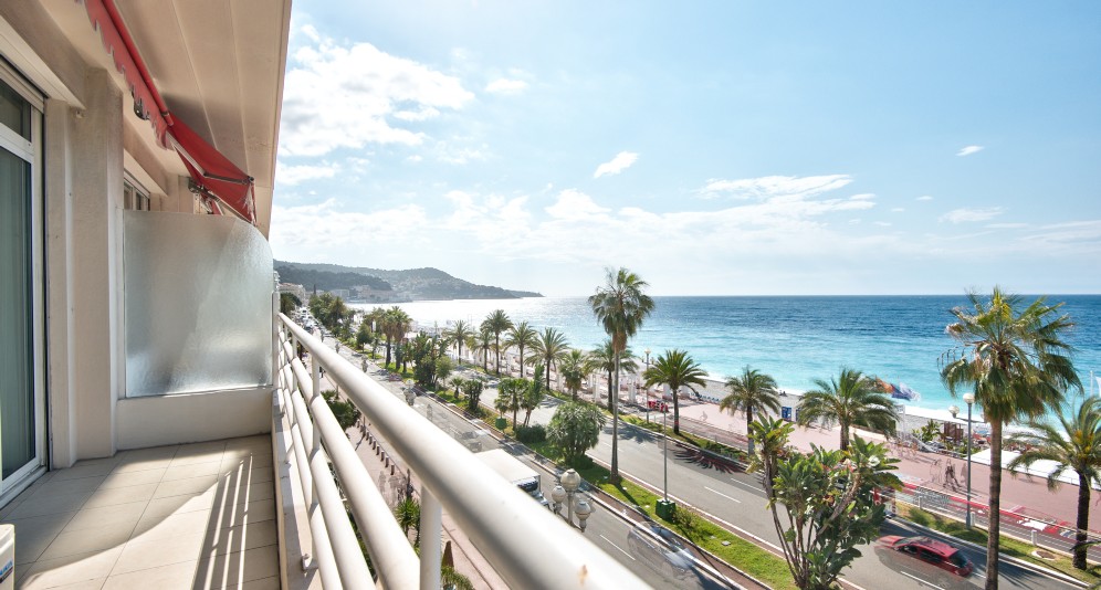 Nizzan Promenade des Anglais’n parhaalla osiolla, Palais de la Méditerranéen ja hotelli Negrescon välissä sijaitseva, erinomaisessa kunnossa oleva läpitalon asunto, jolta aukeaa postikorttimaisemat merelle.