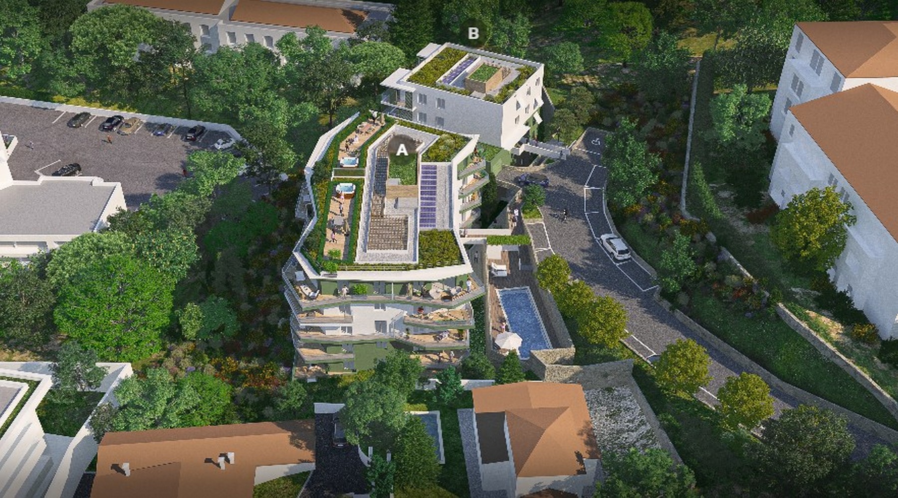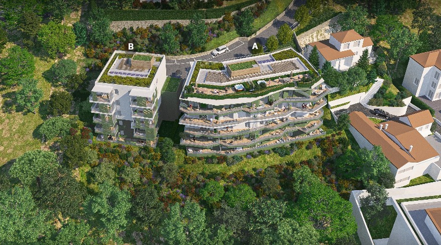 Serenity View on rinnetontille, vehreään ympäristöön rakennettava, kaksi rakennusta käsittävä taloyhtiö, jonka monista asunnoista on avoimet näkymät Var-joen laaksoon ja vastapäisille kukkuloille. Joistain asunnoista on näkymä merelle saakka. Kaikilla asunnoilla on terassi tai pieni piha, ylimmän kerroksen asunnoilla upeat kattoterassit, joille on mahdollista asentaa poreallas. Tontin yläosaan rakennetaan uima-allas. Parkkipaikat sijaitsevat pääasiassa maan alla, jonne on kulku autohissillä. Taloyhtiössä tulee olemaan myös polkupyörävarasto.