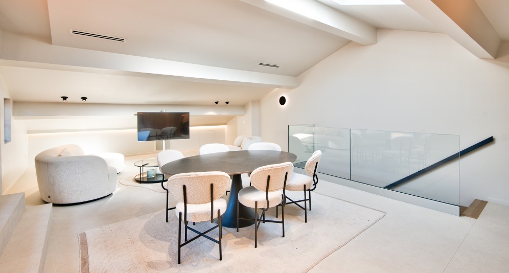 Ylemmässä kerroksessa on tunnelmallinen olohuone avokeittiöllä, josta on käynti upealle 77 m2:n kattoterassille, jolla kesäkeittiö ja osittainen merinäkymä. Tässä kerroksessa on myös kodinhoitohuone. Asuntoon kuuluu kellarivarasto sekä parkkipaikka parkkihallista. Asunto on täysin remontoitu.