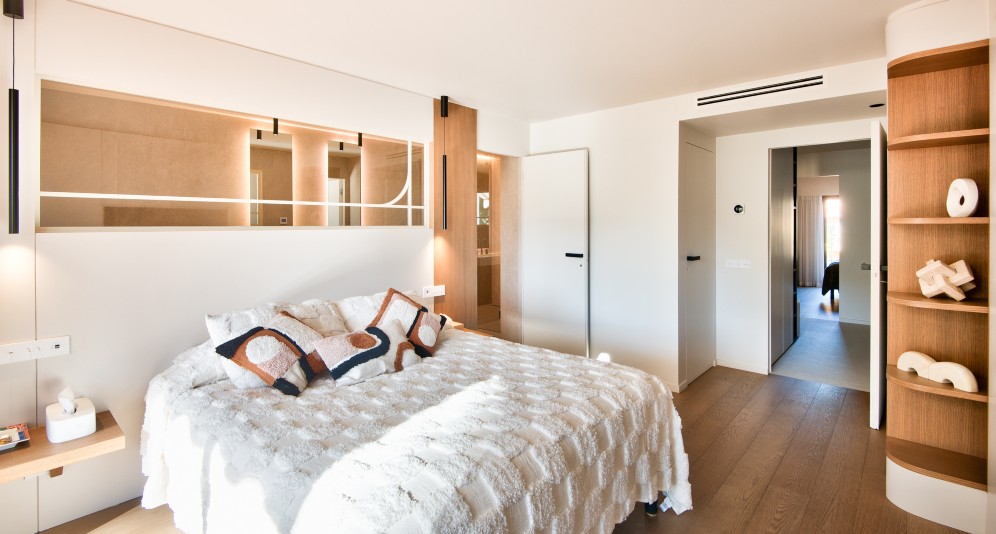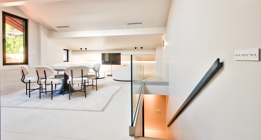 Asunnon alemmassa kerroksessa on eteinen, kolme makuuhuonetta, joista kaikista on käynti terassille tai parvekkeelle. Päämakuuhuoneella on oma kylpyhuoneensa, jossa wc. Kahdella muulla makuuhuoneella on myös omat suihkuhuoneensa. Lisäksi erillinen wc.