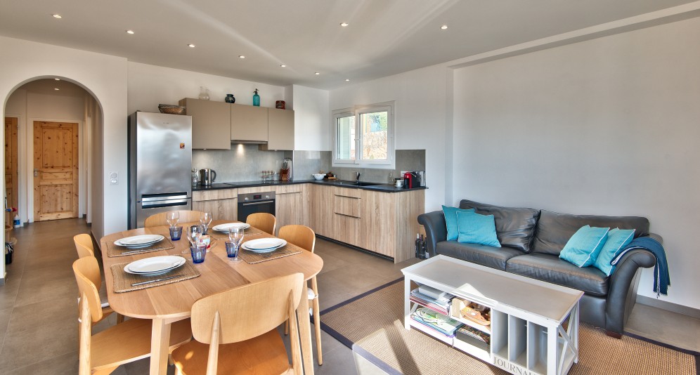 Asunnossa on eteinen, kulmaolohuone avokeittiöllä, kaksi makuuhuonetta ja kylpyhuone, jossa wc. Olohuoneessa on ranskalainen parveke merelle päin. Mahdollisuus ostaa kaksi parkkipaikkaa lisähintaan (60 000 e). Asunto sijaitsee rakennuksen 3. kerroksessa, mutta rinnetontin vuoksi sisäänkäynti on katutasolta.